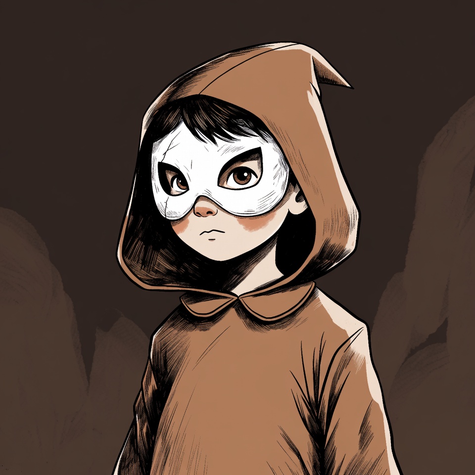 An illustration of a young boy with short black hair wearing a white mask with large eye holes and a serious expression. He is dressed in a brown hooded robe with a collared neckline. The artwork features a dark background with subtle shading.