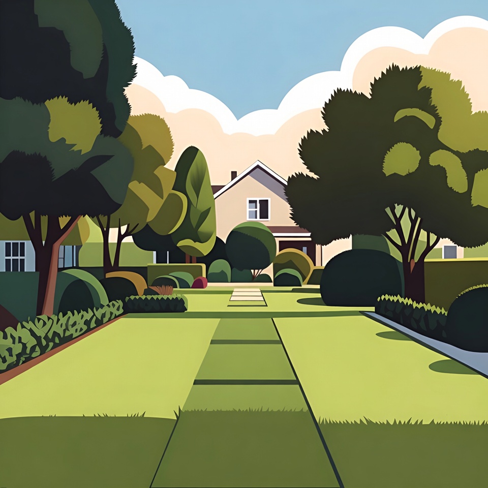 A minimalist illustration depicts a beige house centered in a lush green garden. Tall trees and neatly trimmed bushes frame a straight stone pathway leading to the front door. Fluffy clouds float in the bright blue sky above.