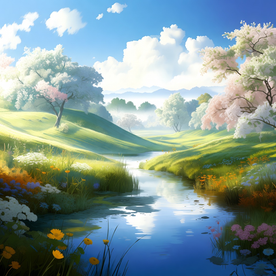 A vibrant digital illustration depicts a lush green valley with blooming white and pink cherry blossom trees under a bright blue sky with fluffy clouds. A clear stream winds through colorful wildflowers and grassy hills, reflecting the surrounding scenery. Misty mountains rise in the distant background.