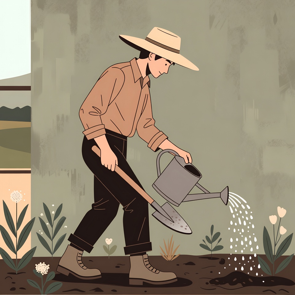 An illustration shows a man in a beige shirt, pants, and hat watering small plants in garden soil with a metal watering can. He holds a shovel in one hand and kneels slightly amid green plants and white flowers. A rustic house and fields are visible in the background against a light green setting.