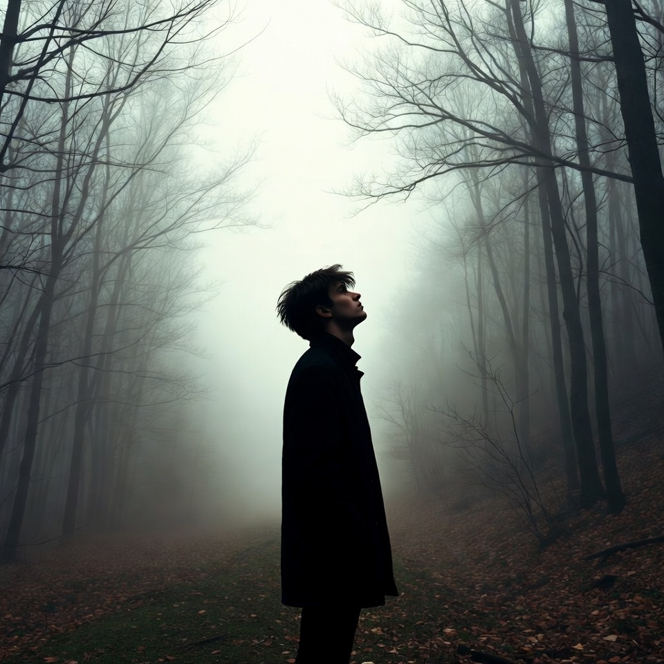 A young man with tousled dark hair stands in a dense foggy forest, wearing a long black coat. He gazes upward with a contemplative expression amid bare trees and misty ground covered in fallen leaves. The scene features tall trunks and a hazy atmosphere.
