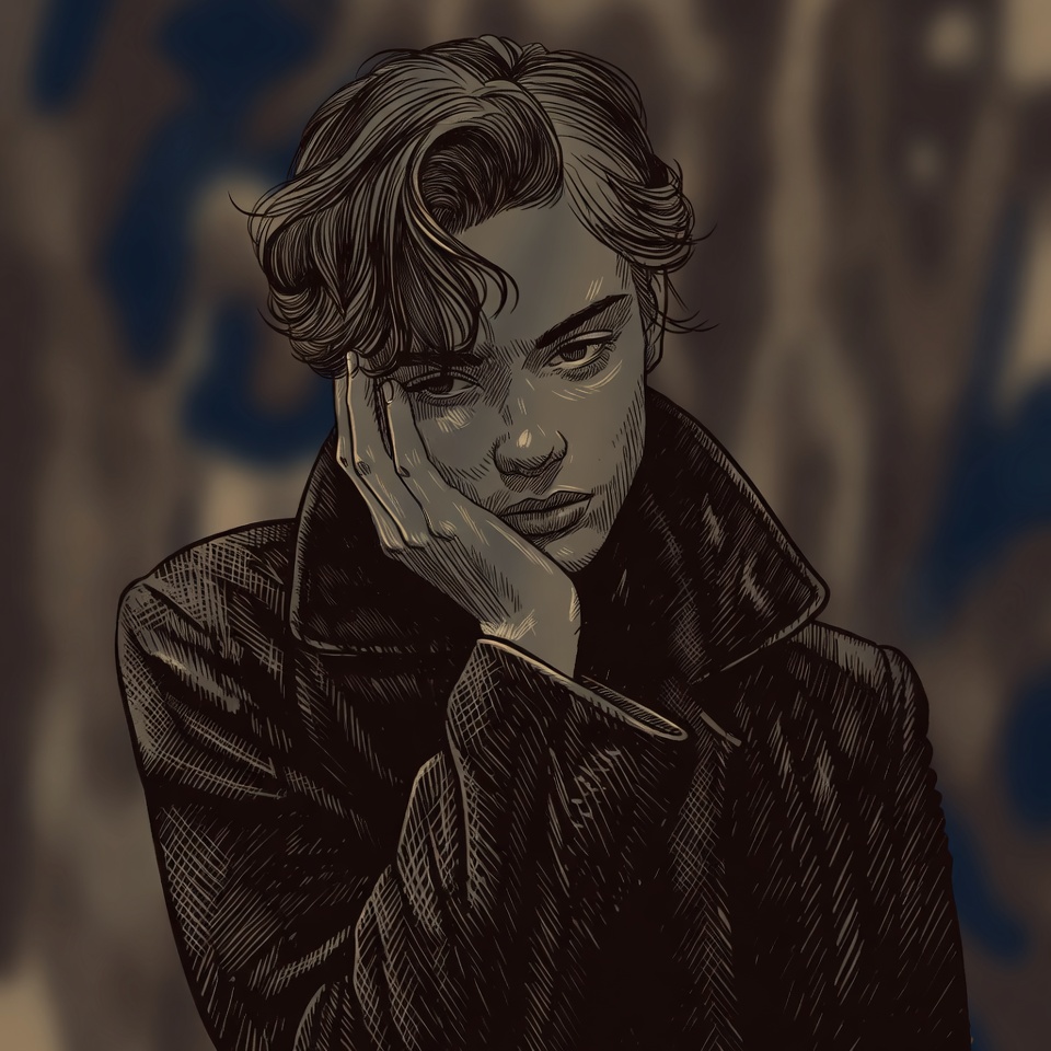 A young man with curly hair rests his chin on his hand in a thoughtful pose. He wears a dark collared coat and has a neutral expression with subtle shadows on his face. The digital illustration features a blurred blue-toned background.