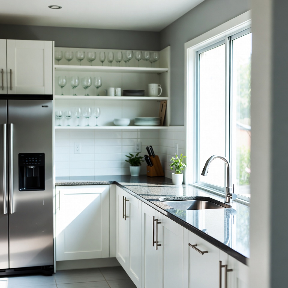 A modern kitchen features white cabinets, a stainless steel refrigerator, and granite countertops. Glassware and dishes are neatly arranged on open shelves above the counters. A large window allows natural light to illuminate the sink area with potted plants nearby.