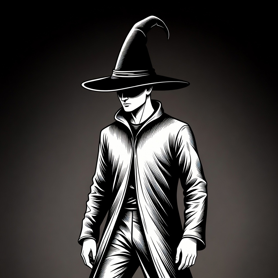 A black and white illustration depicts a man standing with a tall pointed black witch hat and a long open coat. His face is partially shadowed under the wide brim of the hat. The figure is rendered in a detailed line art style on a dark background.