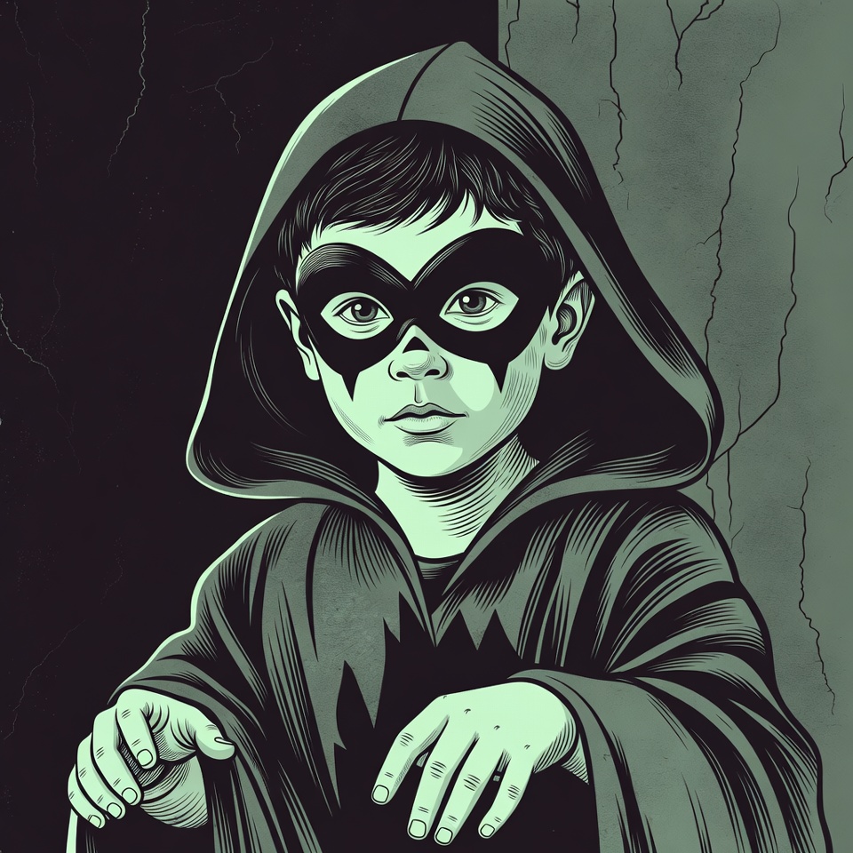 A young boy with a black mask covering his eyes wears a dark hooded cloak in a dramatic neon green and black illustration. He stands against a textured dark background with lightning effects and cracks. His hands are extended forward in a mysterious pose.