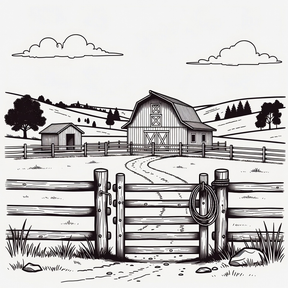 A black and white line drawing depicts a large red barn with a smaller shed in a rural landscape. A wooden fence with a lassoed gate stands in the foreground, leading to the barn via a dirt path. Rolling hills, trees, and clouds fill the background under a clear sky.