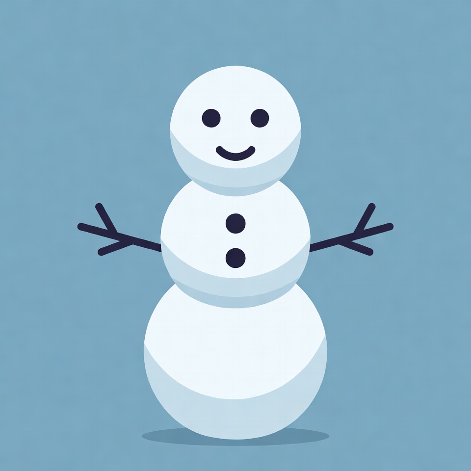 A simple flat illustration of a cheerful snowman stands on a light blue background. The snowman has three white snowballs for body, black dot eyes and mouth, and thin black twig arms outstretched.