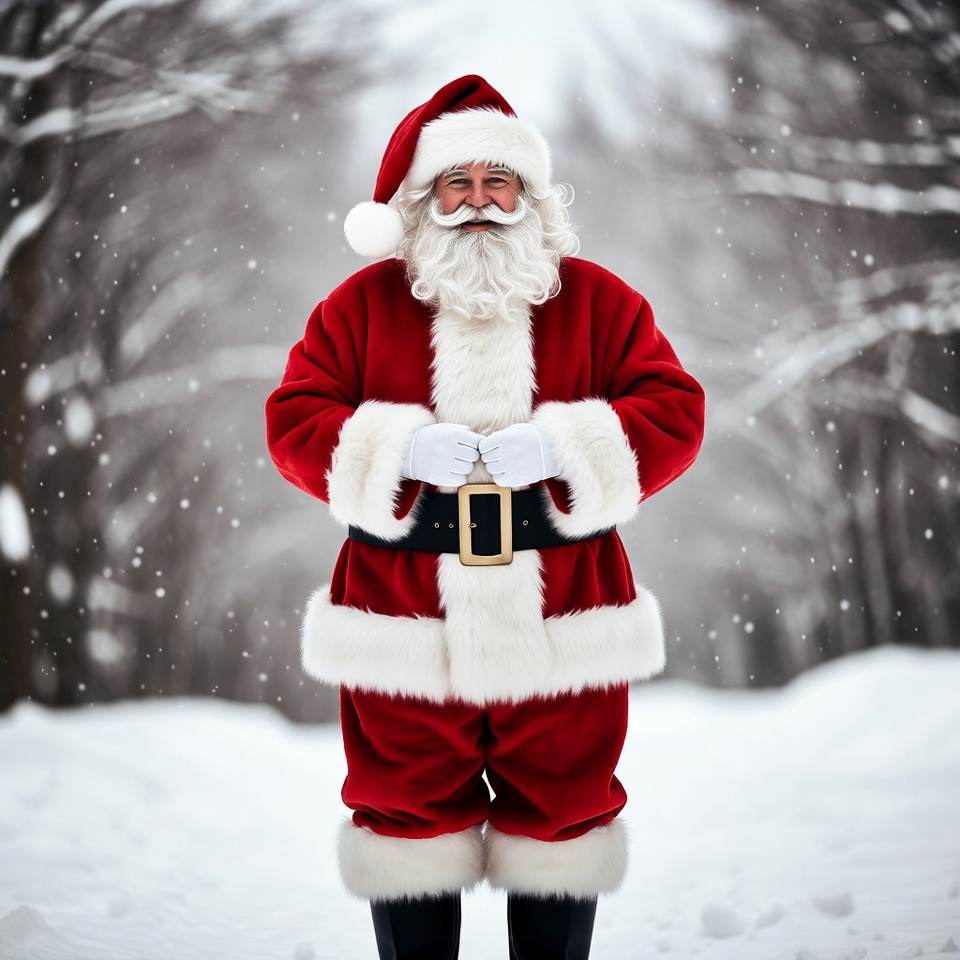 Santa Claus dressed in a red fur-trimmed suit with white gloves and black boots stands in a snowy forest. He has a long white beard, smiling face, and red hat with white pom-pom. Snowflakes fall around him amid snow-covered trees.