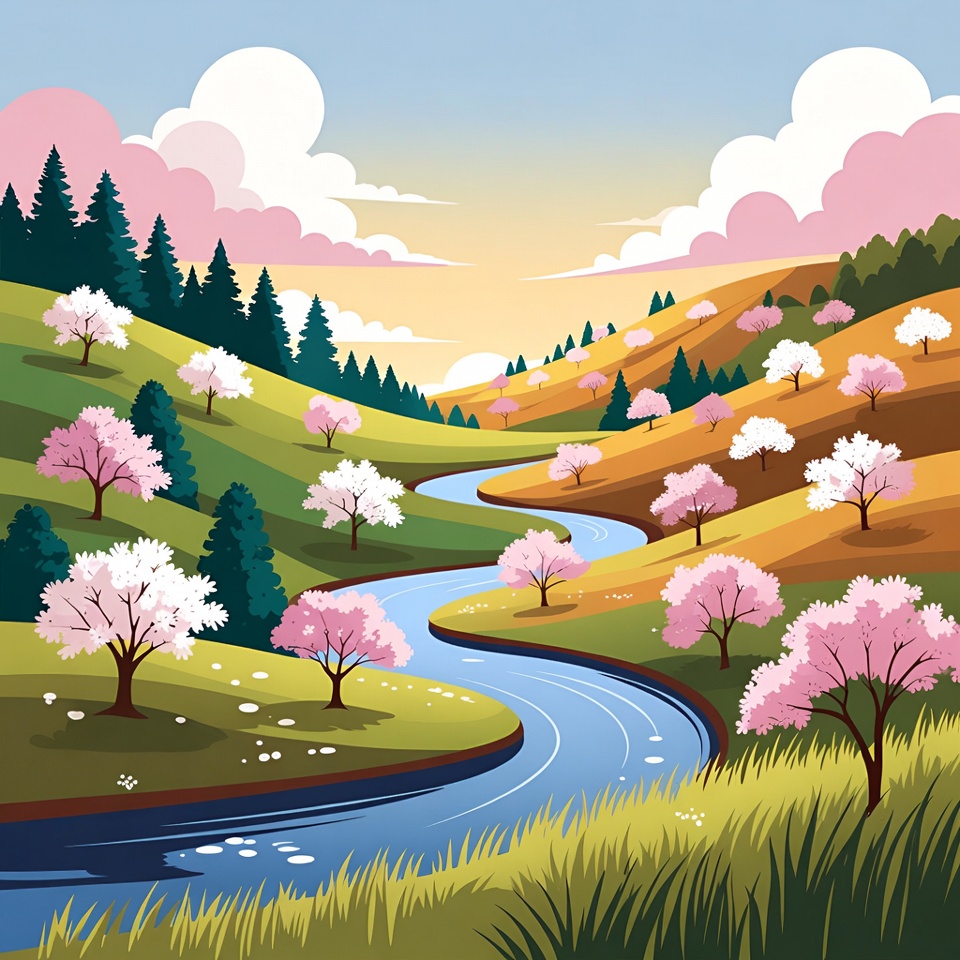 A vibrant vector illustration depicts a winding blue river flowing through rolling green hills covered in blooming pink and white cherry blossom trees. Dark green pine trees dot the landscape under a sky with fluffy clouds at sunset. Grassy meadows and scattered blossoms add detail to the serene natural scene.