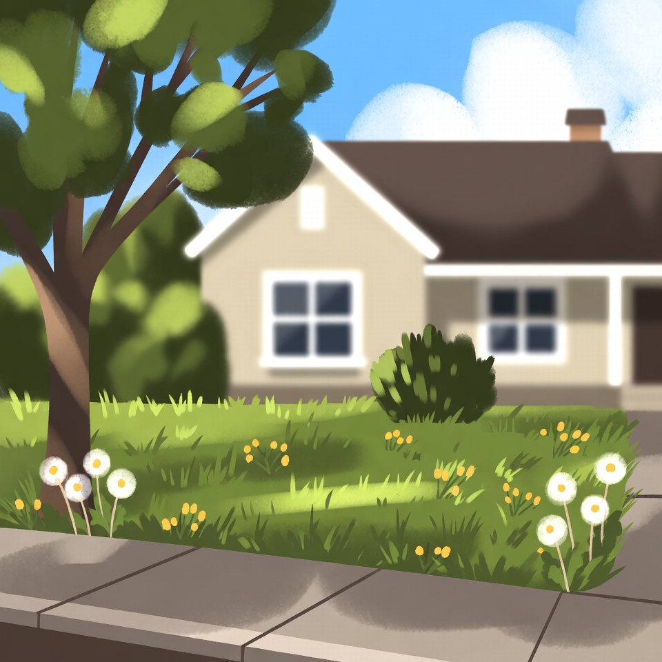 A digital illustration depicts a cozy beige house with white trim and a chimney, situated on a grassy lawn with scattered white daisies and yellow flowers. A large green tree stands prominently in the foreground next to a concrete sidewalk. The scene features a clear blue sky with fluffy white clouds.