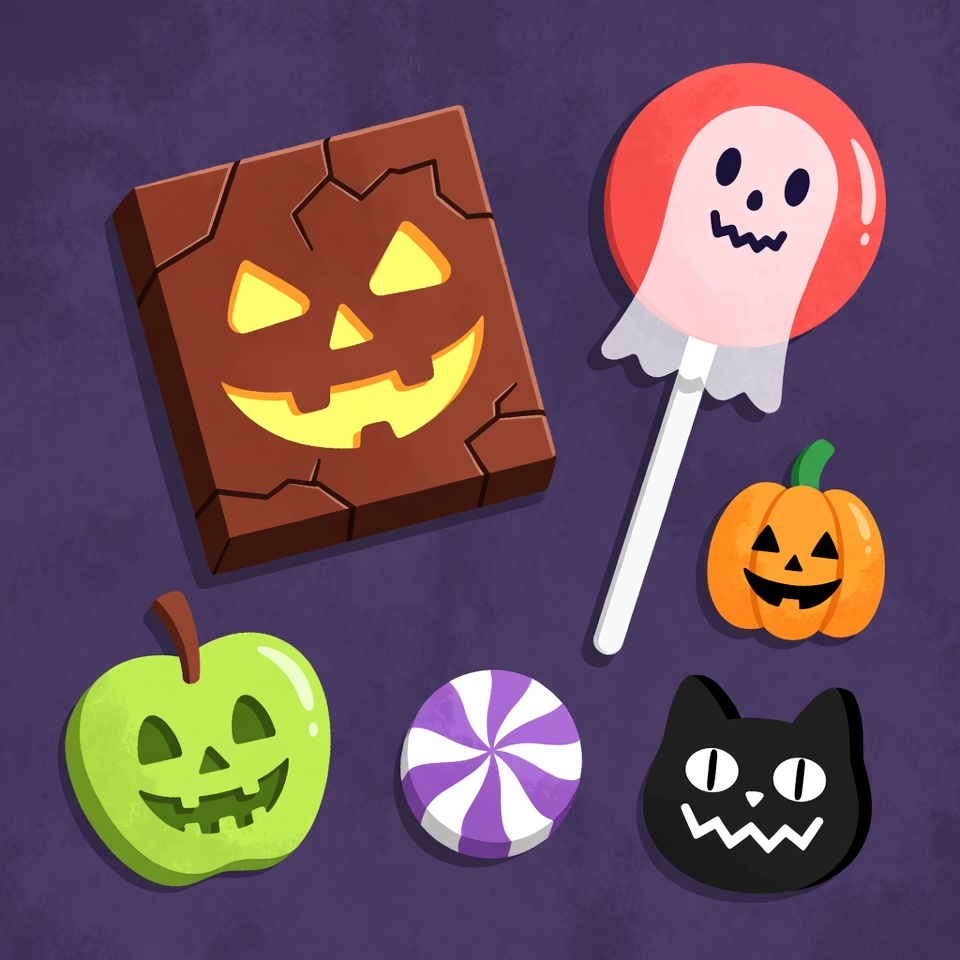 A vibrant Halloween illustration features a cracked chocolate bar with glowing jack-o'-lantern face, a pink ghost lollipop, a carved pumpkin, a green jack-o'-lantern apple, a purple swirled candy, and a black cat with sharp teeth. All items are arranged on a textured purple background. The cartoon-style graphics use bold colors and exaggerated features typical of festive clipart.