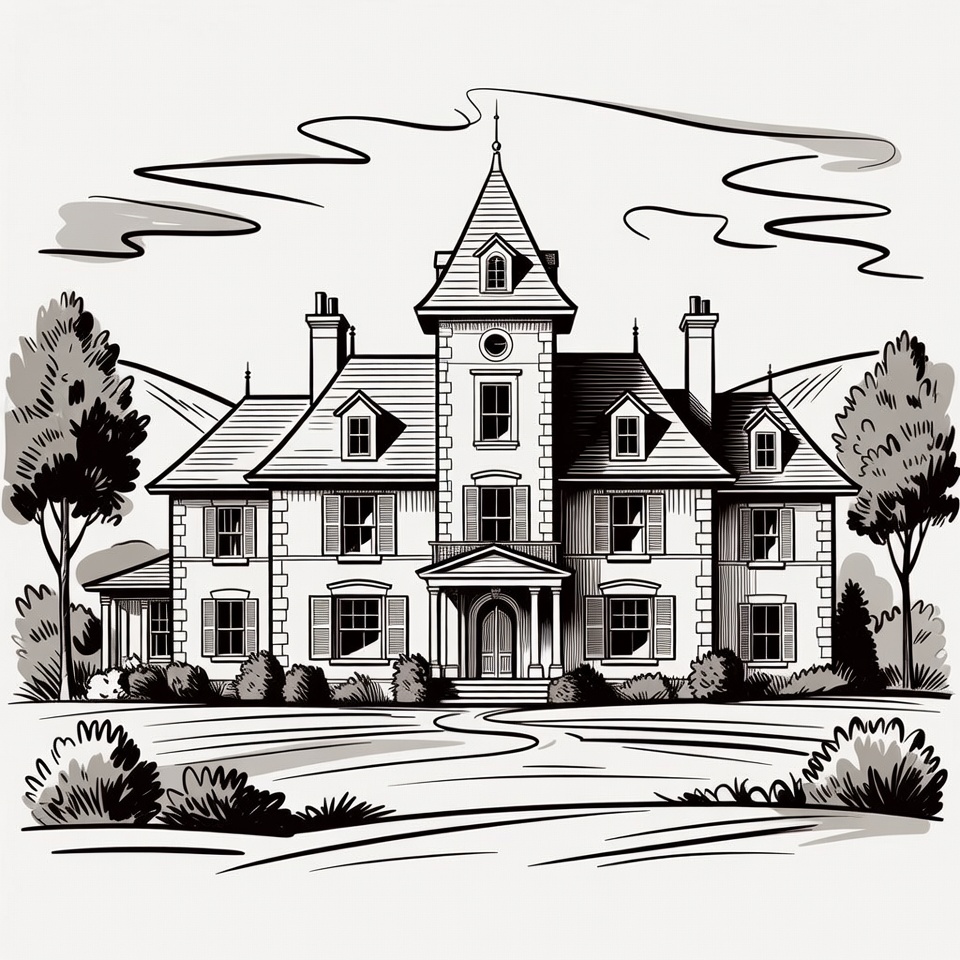 architecture, black and white, chimneys, clipart, clock tower, clouds, driveway, estate, front entrance, grand house, house drawing, isolated background, line drawing, manor, mansion illustration, mountains, shrubs, shuttered windows, trees, turret, Victorian mansion