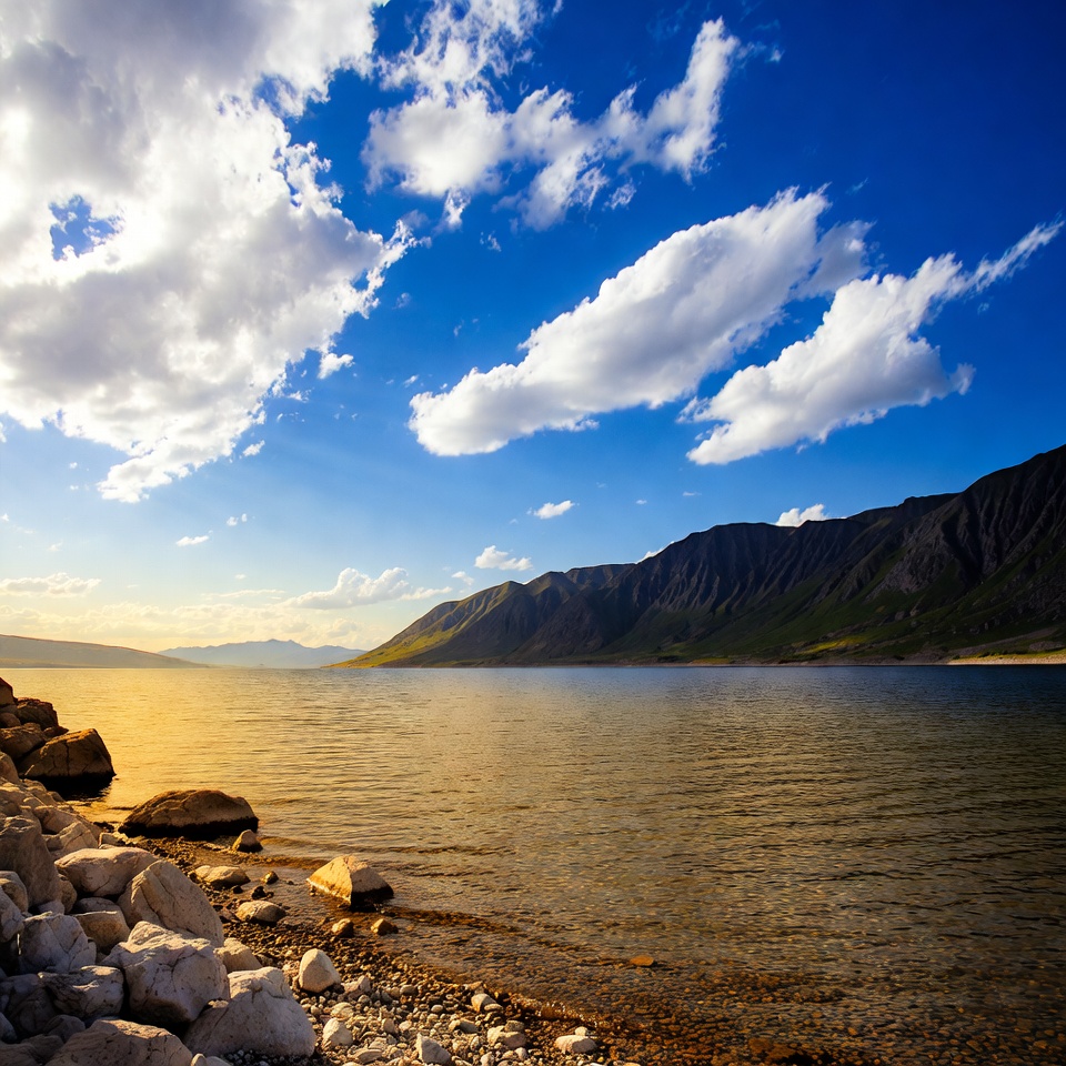 A serene lake reflects golden sunlight with rocky shores in the foreground. Snow-capped mountains rise dramatically against a vibrant blue sky dotted with fluffy white clouds. The scene captures a peaceful waterside landscape during sunset.