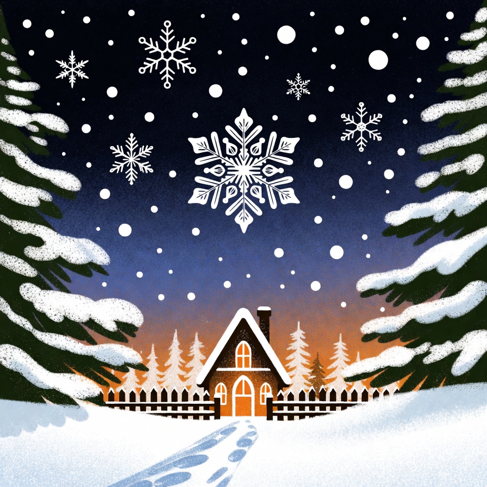 A cozy brown cabin with a chimney sits in a snowy landscape surrounded by evergreen pine trees. Snowflakes float in the night sky with a gradient from deep blue to orange near the horizon. A snowy path leads to the cabin's orange door, enclosed by a white picket fence.