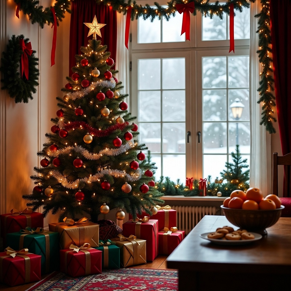 A tall decorated Christmas tree with red and gold ornaments stands in a cozy living room beside a large window showing a snowy outdoor scene. Colorful holiday garlands drape the walls and curtains, while wrapped gifts in red, gold, and green stack around the tree base. A wooden table nearby holds a bowl of oranges, Christmas cookies on a plate, and additional wrapped presents.