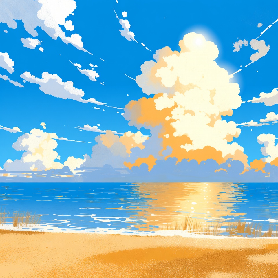 anime style, blue sky, bright sky, cel shaded, clouds, digital art, fluffy clouds, golden sand, grass, illustration, nature, ocean, orange glow, reflection, sand, seascape, serene beach, shore, sky, summer beach, sunset, turquoise water, vibrant colors, waves, white clouds, beach