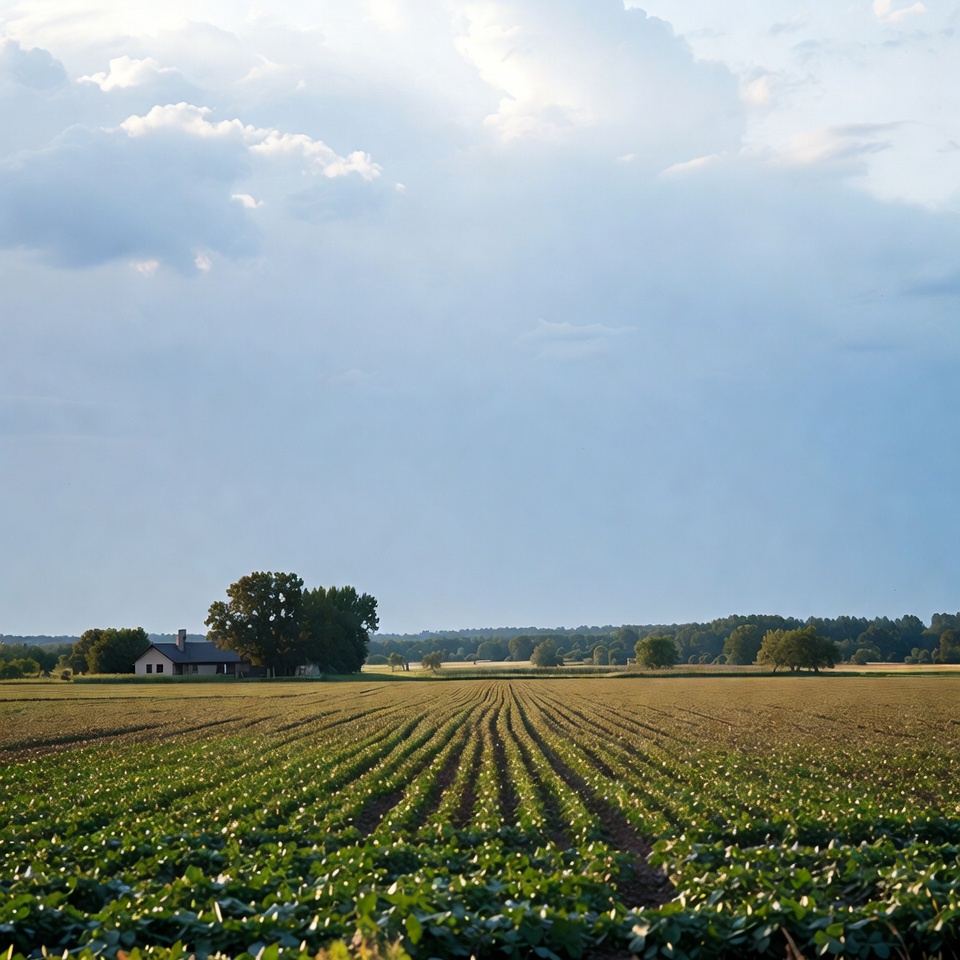 A vast soybean field with neatly plowed rows stretches under a partly cloudy sky. A white farmhouse with a red roof sits near a cluster of trees in the distance. The scene features open farmland with scattered trees and a bright horizon.