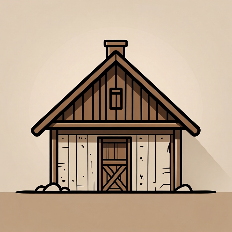 A simple line art illustration of a wooden log cabin features a steep gabled roof, a stone chimney, and a cross-braced door. The cabin stands on a snowy base with a subtle drop shadow. It is depicted in brown tones against a beige background.