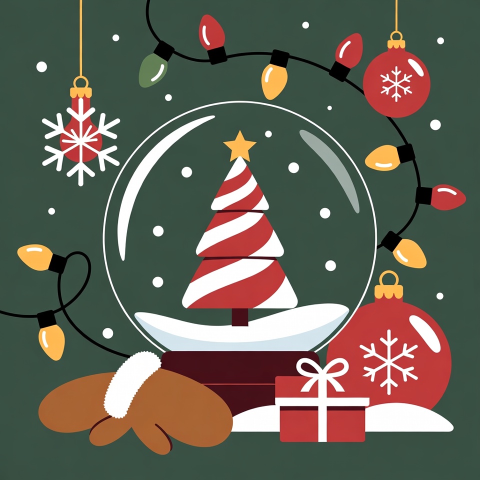 A vibrant illustration features a glass snow globe containing a small striped Christmas tree topped with a star, surrounded by falling snowflakes. Colorful holiday lights, red ornaments, white snowflakes, a red gift box, and brown mittens are arranged around the globe on a green background. The festive scene is rendered in a flat, clipart style with bold colors.