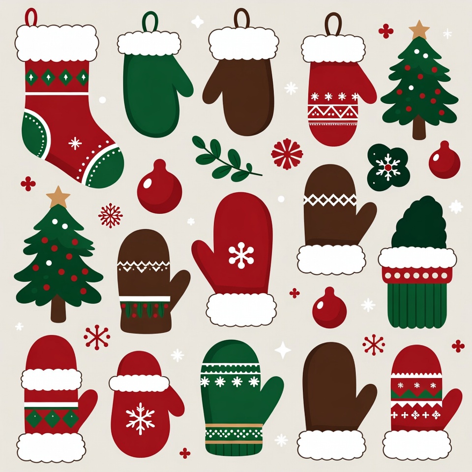 A collection of colorful Christmas clipart features red and green stockings with white fur trim. Various mittens and gloves in green, red, and brown are depicted alongside small decorated Christmas trees. Red ornaments, stars, snowflakes, and green branches are scattered on a light beige background.