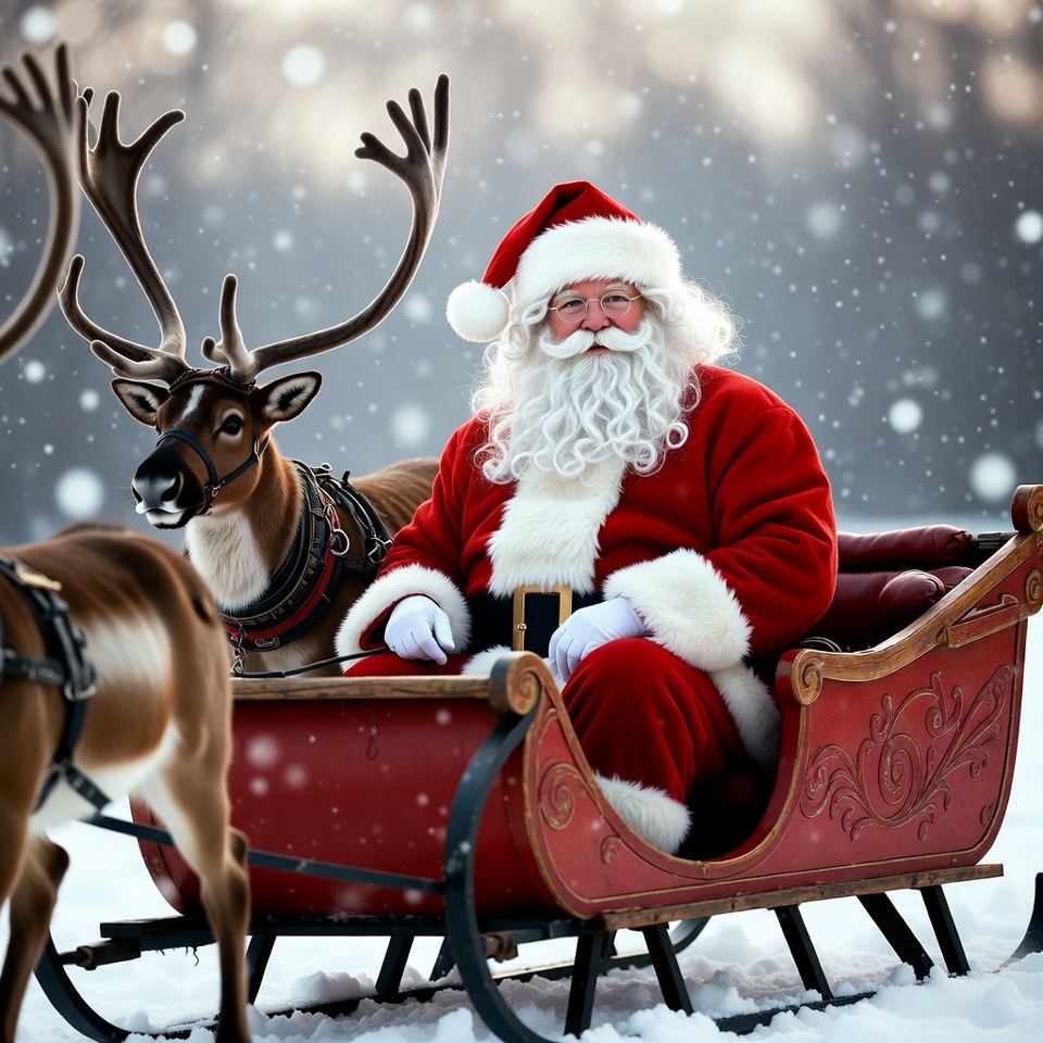 Santa Claus with a white beard sits in a red ornate sleigh pulled by two reindeer with large antlers. He wears a classic red suit, white-trimmed hat, and black boots, holding reins in the snowy landscape. Snowflakes fall around the festive scene on a white background.