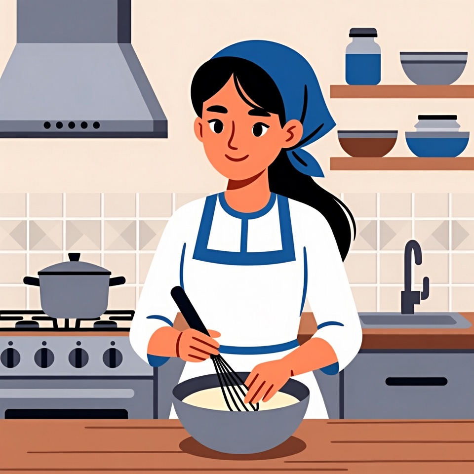 An Asian woman with long black hair tied in a blue headscarf wears a white apron with blue trim while whisking batter in a large gray bowl. She stands at a wooden counter in a modern kitchen with a stove, pots, sink, and shelves stocked with blue and brown jars and bowls in the background. The scene is a colorful vector illustration.