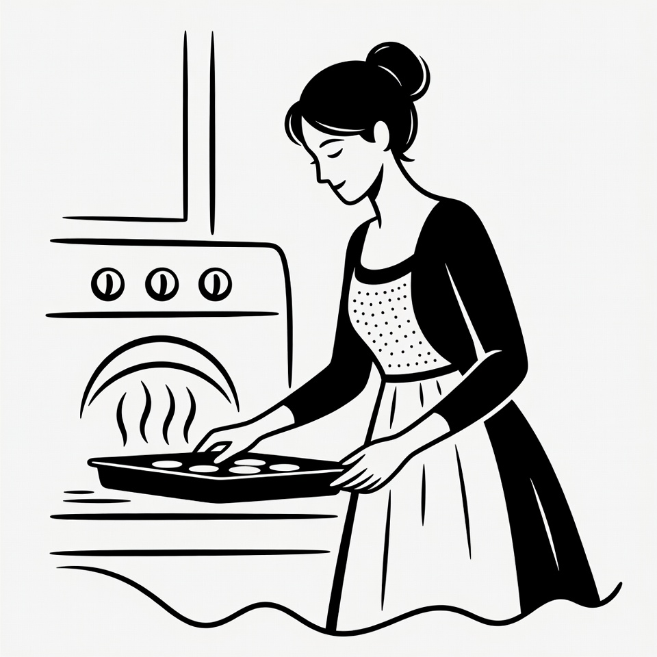 A black and white line art illustration depicts a woman with hair in a bun wearing a dress and apron. She bends forward to pull a baking tray of cookies from an open oven with steam rising. The scene shows a kitchen counter and cabinet in the background.