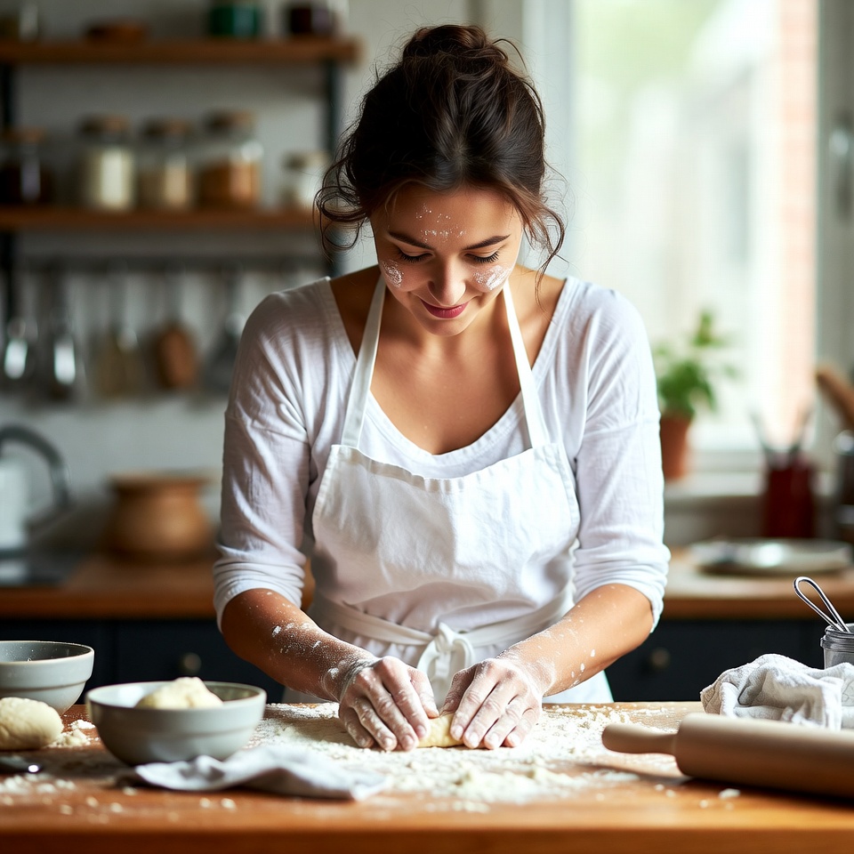 A woman with dark hair in a bun wears a white apron over a long-sleeved shirt while kneading dough on a wooden kitchen counter. Flour dusts her hands, face, and apron, with bowls of dough and kitchen utensils nearby. Wooden shelves stocked with jars and kitchenware line the background behind a window.