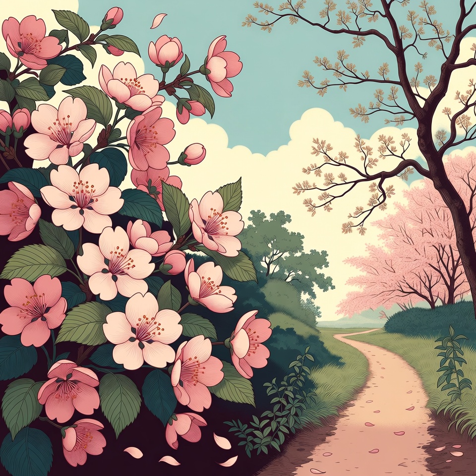 A vibrant illustration features clusters of pink cherry blossoms in full bloom on bushes framing a winding dirt path. Bare branches and scattered petals extend into a serene landscape with green hills, distant trees, and a soft blue sky with fluffy clouds. The scene captures a peaceful springtime garden pathway.