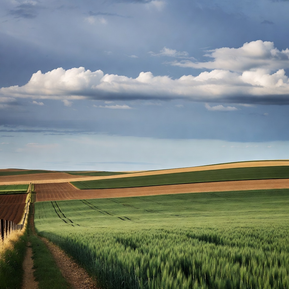 agriculture, blue sky, brown soil, clouds, colorful fields, crop rows, crops, dirt path, farmland, field path, golden fields, green fields, green wheat, landscape, plowed land, rolling hills, rural scenery, sky clouds, wheat field, farm fields