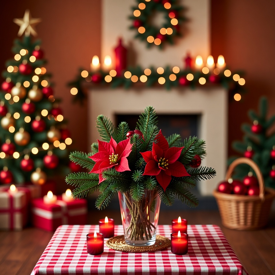 A vibrant red poinsettia arrangement with fir branches stands in a clear glass vase on a red checkered tablecloth. Surrounding it are lit red candles on woven mats, wrapped gifts, and a wicker basket with gold ornaments. The scene features a cozy fireplace with garland, illuminated Christmas trees adorned with lights and balls, and warm holiday decor in a softly lit room.