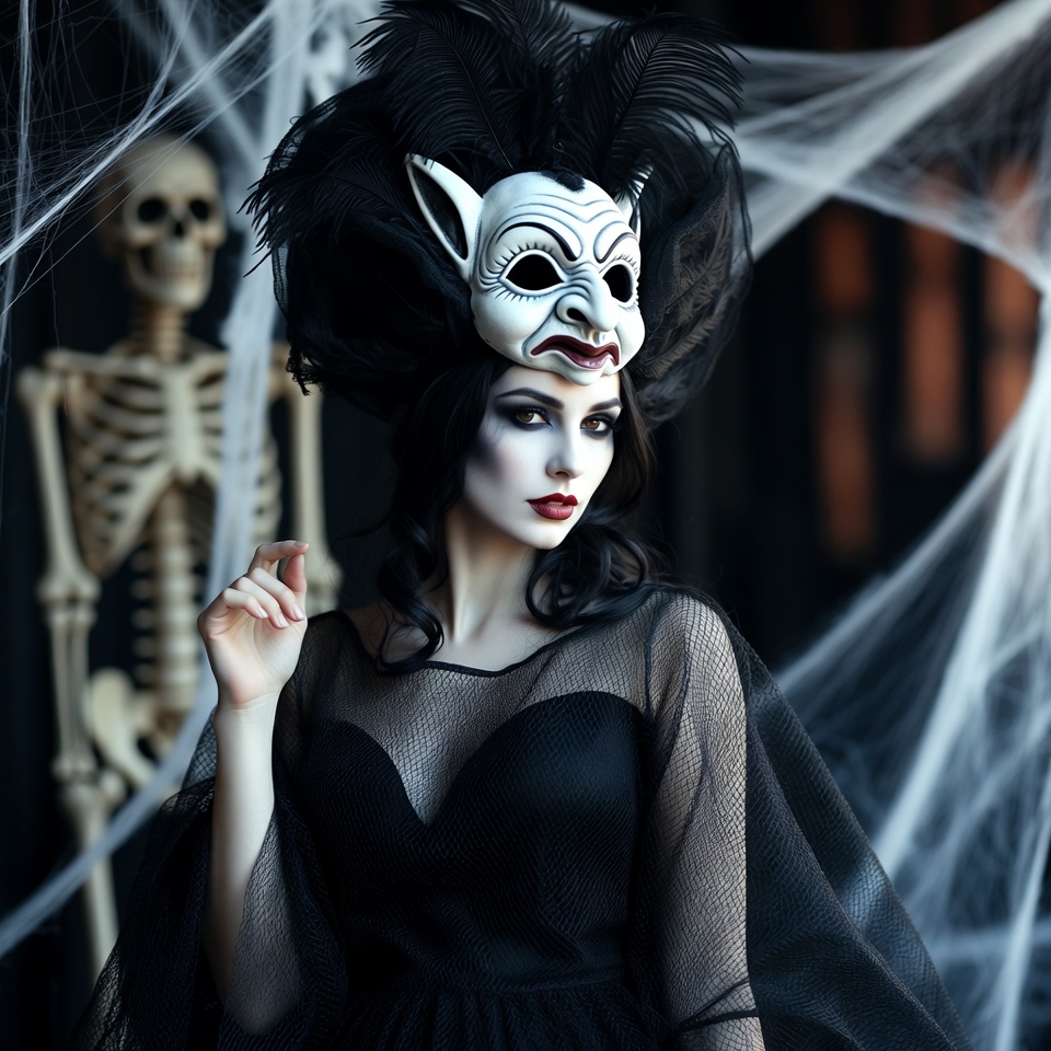 A woman with pale skin and dark wavy hair wears a large white demon mask with horns and black feathers on her head. She poses in a sheer black lace dress with cobwebs and skeletons in the dark background. Her hand is raised near her face in a dramatic gesture.