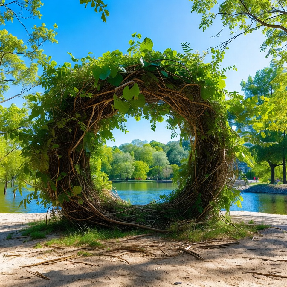 blue sky, branches, circular frame, environmental art, foliage, garden arch, grass, green leaves, green vines, lake view, landscape, lush greenery, natural tunnel, nature frame, outdoor art, park path, park sculpture, pathway, serene lake, spring nature, sunny day, trees, water, woven circle, vine arch