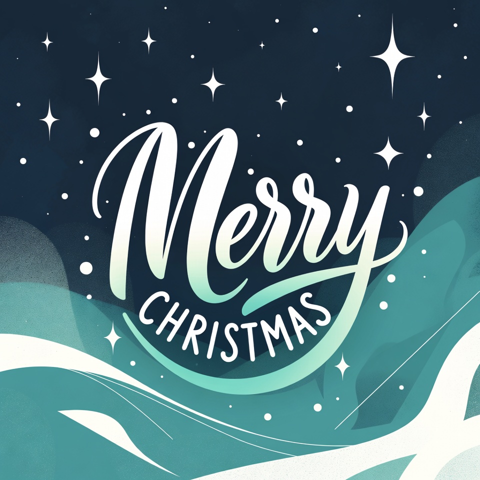 A festive illustration features the words 'Merry Christmas' in elegant white script lettering. The text is set against a dark navy background adorned with sparkling white stars and subtle teal wavy patterns.