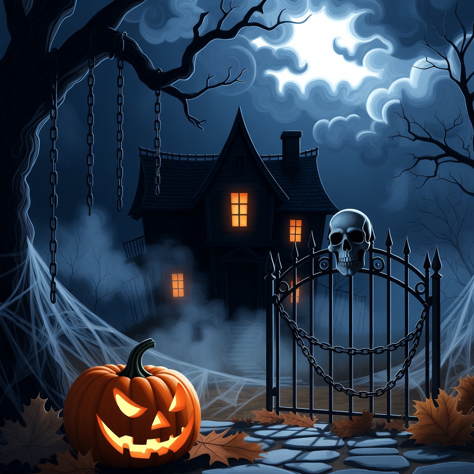 A spooky gothic mansion stands behind a wrought iron gate adorned with chains and a skull under a full moon. A carved jack-o-lantern with glowing eyes sits on a stone path lined with fallen leaves and spider webs. Twisted bare trees and fog surround the eerie Halloween scene.