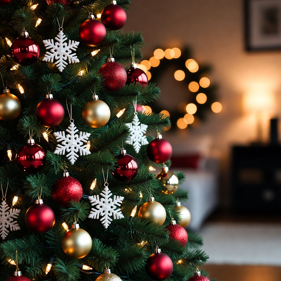 A beautifully decorated Christmas tree stands in a cozy living room with warm lighting. It features red and gold ornaments, white snowflake decorations, and twinkling lights on green branches. A blurred background shows furniture and bokeh lights enhancing the holiday ambiance.