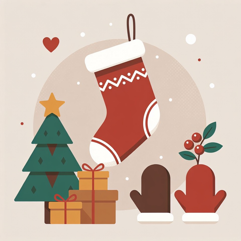A vibrant illustration features a large red Christmas stocking with white trim hanging prominently. Surrounding it are a green Christmas tree, stacked brown gift boxes with bows, red holly leaves and berries, a gold star, a heart, snowflakes, and a pair of brown mittens. The elements are arranged on a beige background with a subtle circular frame.
