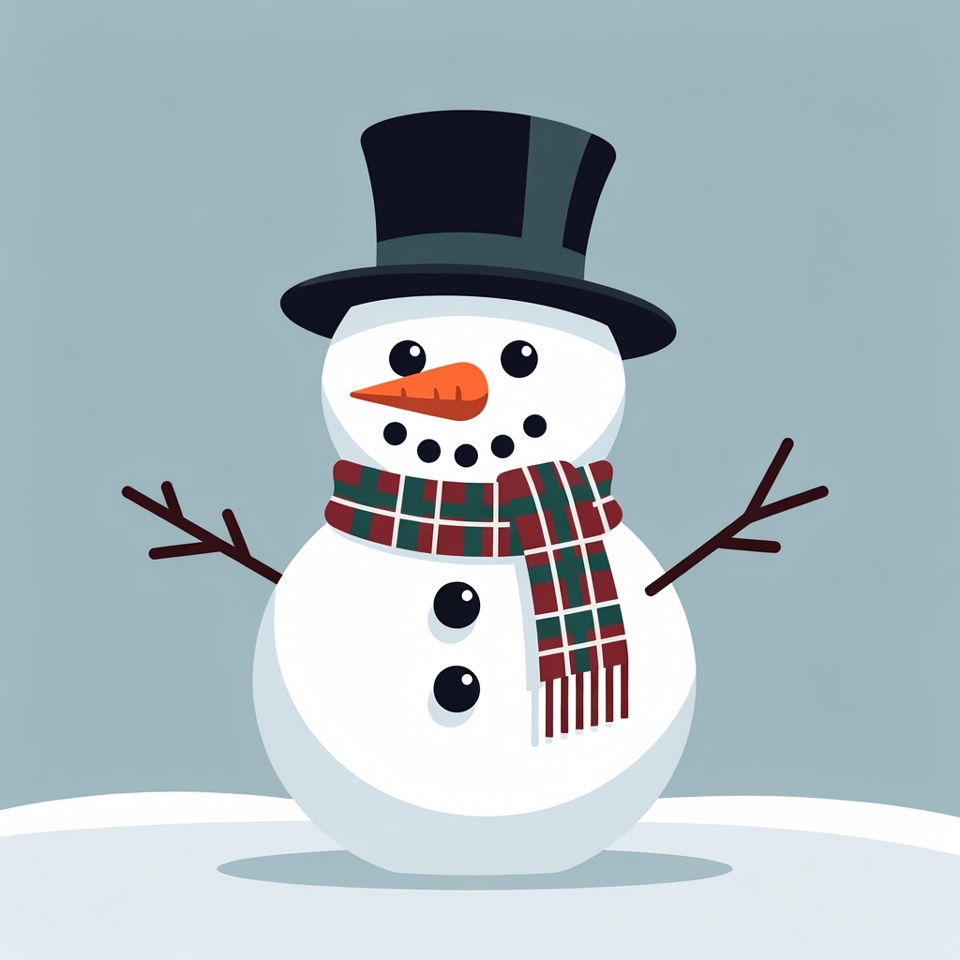 A cheerful cartoon snowman stands on a snowy ground with a light blue background. It wears a black top hat, a red and green plaid scarf, and has a carrot nose, black eyes, and a smiling mouth. The illustration features thin stick arms and a simple, isolated design.