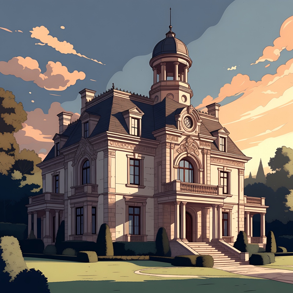 architecture, balustrade, bushes, chimneys, clock tower, clouds, digital art, dome, entrance, estate, grand mansion, grass, house, illustration, lawn, luxury home, sky, stairs, stone building, sunset, trees, windows, mansion
