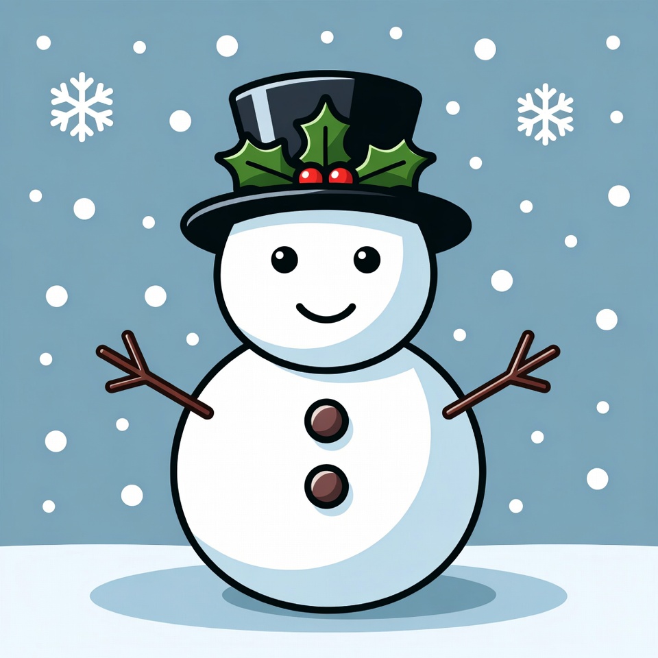 A cute cartoon snowman stands on a snowy ground with a blue background. It wears a black top hat decorated with holly leaves and red berries, and has thin stick arms outstretched. Snowflakes surround the smiling snowman with black dot eyes, mouth, and buttons.
