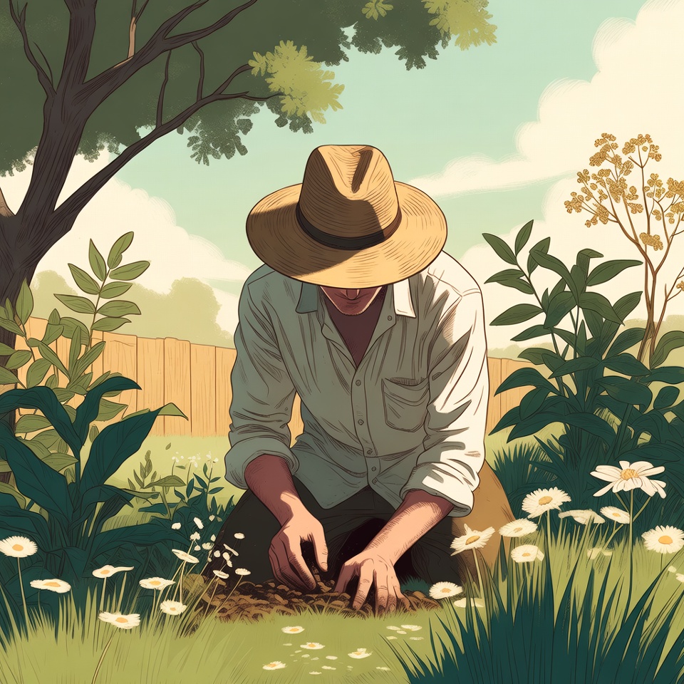 White, backyard, clouds, daisies, dirt, flowers, foliage, garden, gardening, grass, green leaves, hands, hat, illustration, kneeling, male, nature, outdoors, planting flowers, plants, sky, soil, sunny day, tree, white shirt, wooden fence, man
