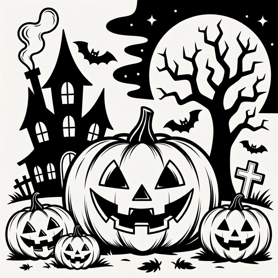 Black and white clipart illustration features a large grinning jack-o-lantern surrounded by smaller carved pumpkins on grassy ground. A spooky haunted house with bats flying around stands behind, next to a crooked tree, crescent moon, and gravestone. Swirling mist and stars fill the night sky.