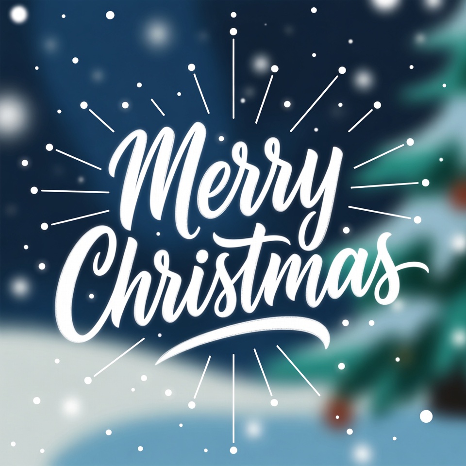 A festive illustration features the words 'Merry Christmas' in elegant white handwritten script with sparkling rays. Snowflakes fall around a blurred Christmas tree with red ornaments in the background. The design uses a deep blue gradient for a wintry holiday effect.