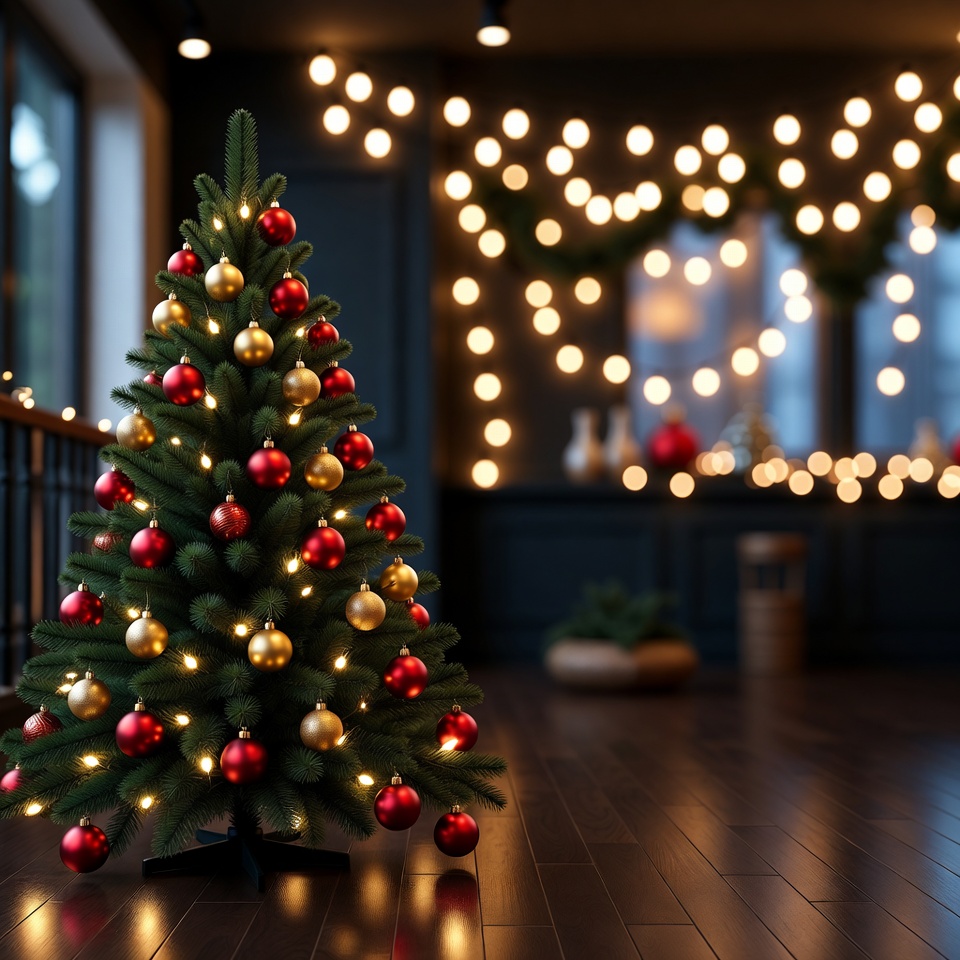 A decorated Christmas tree stands in a modern living room with warm lighting. The tree is adorned with red and gold ornaments, string lights, and a glowing star topper. Bokeh holiday lights and garlands create a festive blurred background with wooden floors and windows.