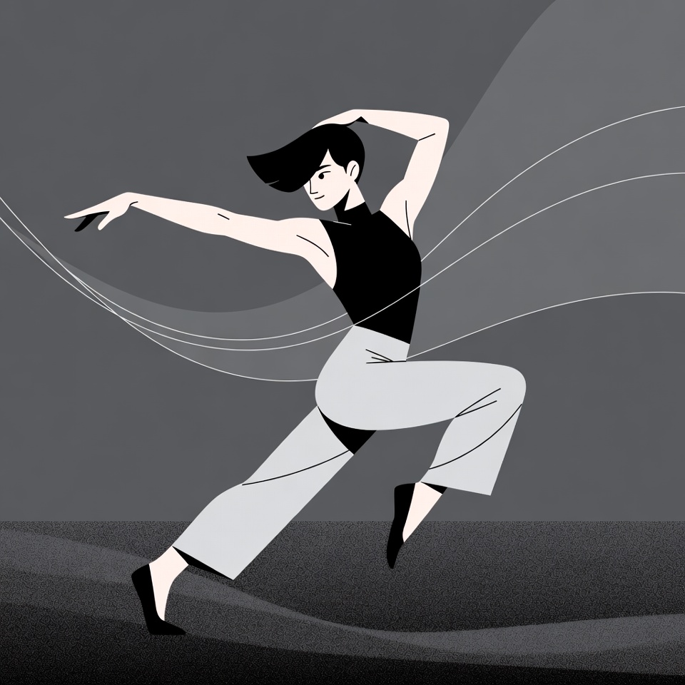 A stylized illustration of a woman in a black tank top and loose gray pants performs a dynamic dance leap. Her arms are extended gracefully with flowing motion lines, and she wears black ballet flats. The figure is rendered in black and white line art against a gradient gray background.