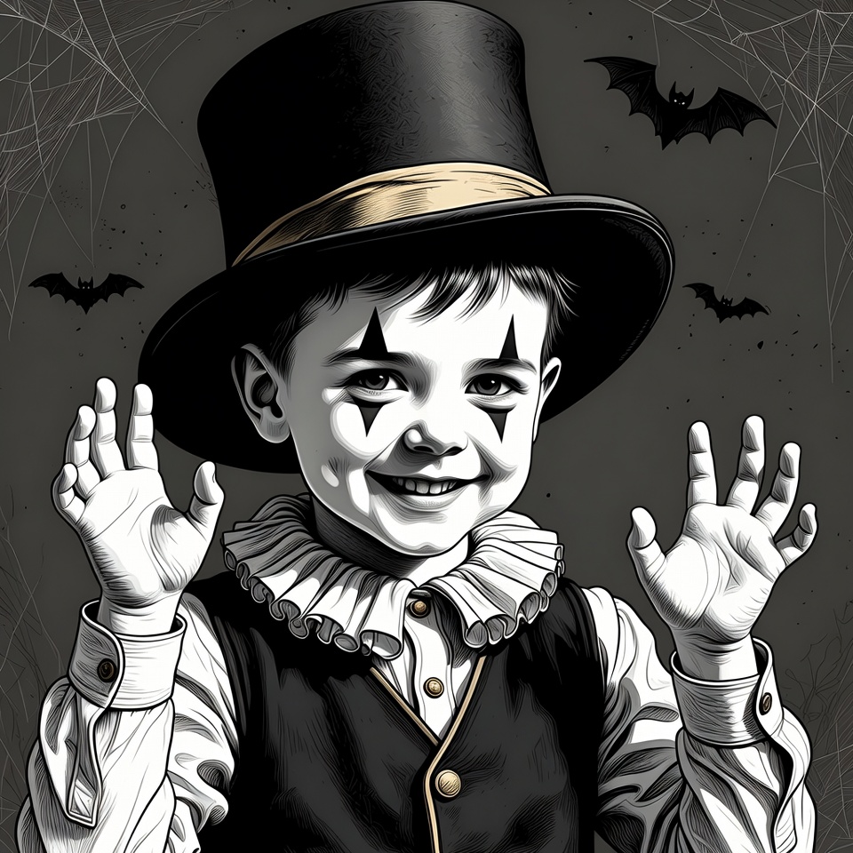 An illustration of a young boy dressed as a clown or ringmaster, wearing a black top hat with a gold band, white ruffled collar, and black vest over a white shirt. He smiles happily with white face paint and black accents around his eyes and mouth, raising both hands with fingers spread. The dark background features spider webs and flying bats.