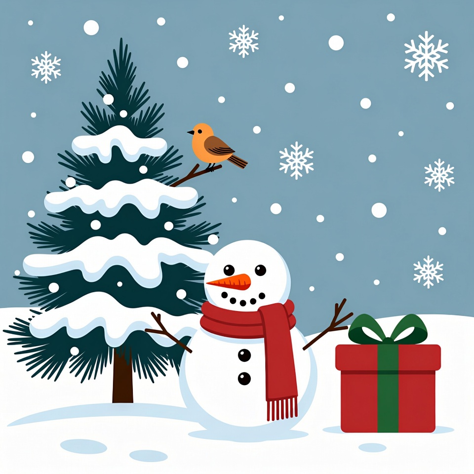 A cheerful snowman with a red scarf and carrot nose stands in the snow holding a green ribbon on a red gift box. A robin bird perches on a snow-covered pine tree beside the snowman. Snowflakes fall against a light blue winter background in this clipart illustration.