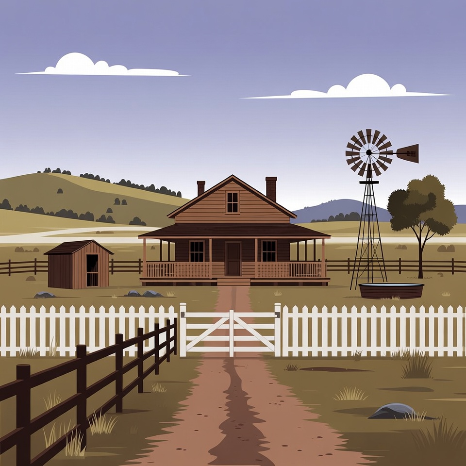 A flat illustration depicts a brown wooden farmhouse with a wraparound porch and chimney, surrounded by a white picket fence and dirt path. A tall windmill stands nearby with a water trough, accompanied by a small shed and a tree. Rolling green hills, blue sky with clouds, and dry grass form the rural landscape background.