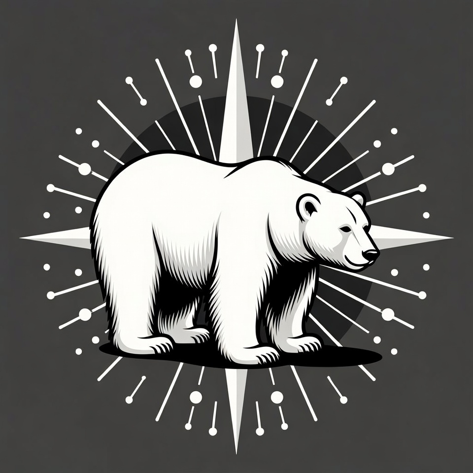 A white polar bear stands powerfully in profile on a dark gray background. It is surrounded by a radiant white compass starburst with pointed rays and dots. The illustration features bold line art and subtle shadows for a dynamic effect.