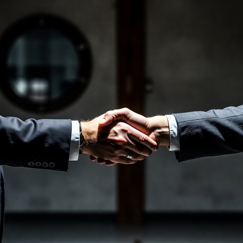 Two men in dark suits shake hands firmly in a dimly lit room. A large round window and wooden beam are visible in the blurred background. Their white shirt cuffs and wedding rings are prominent in the close-up view.